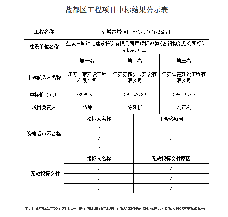 鹽城市城鎮(zhèn)化建設投資有限公司屋頂標識牌(含鋼構架及公司標識牌Logo)工程中標公示