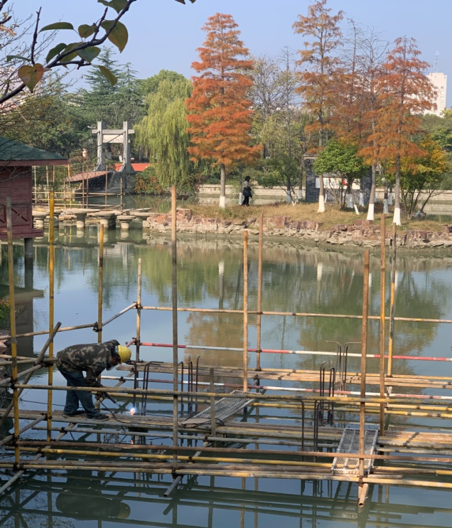 一夜氣溫驟降,從暖秋進(jìn)入寒冬,寒風(fēng)勁吹,但在世紀(jì)公園內(nèi),呈現(xiàn)在人們面前的卻是一派熱火朝天的施工景象,機(jī)器隆隆,電光閃爍,施工人員頂著寒風(fēng),爭(zhēng)分奪秒,奮戰(zhàn)在施工一線,有的在搭建腳手架、有的在焊割鋼材、有的在搬運(yùn)材料……