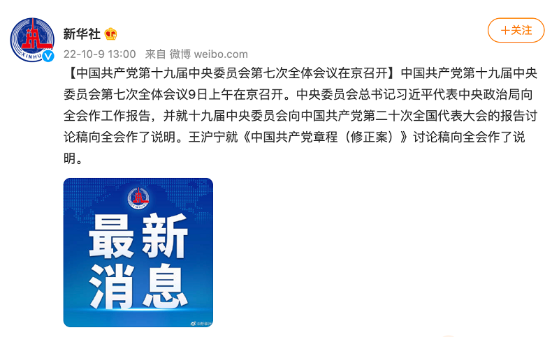 【中國(guó)共產(chǎn)黨第十九屆中央委員會(huì)第七次全體會(huì)議在京召開】中國(guó)共產(chǎn)黨第十九屆中央委員會(huì)第七次全體會(huì)議9日上午在京召開。中央委員會(huì)總書記習(xí)近平代表中央政治局向全會(huì)作工作報(bào)告,并就十九屆中央委員會(huì)向中國(guó)共產(chǎn)黨第二十次全國(guó)代表大會(huì)的報(bào)告討論稿向全會(huì)作了說明。王滬寧就《中國(guó)共產(chǎn)黨章程(修正案)》討論稿向全會(huì)作了說明。